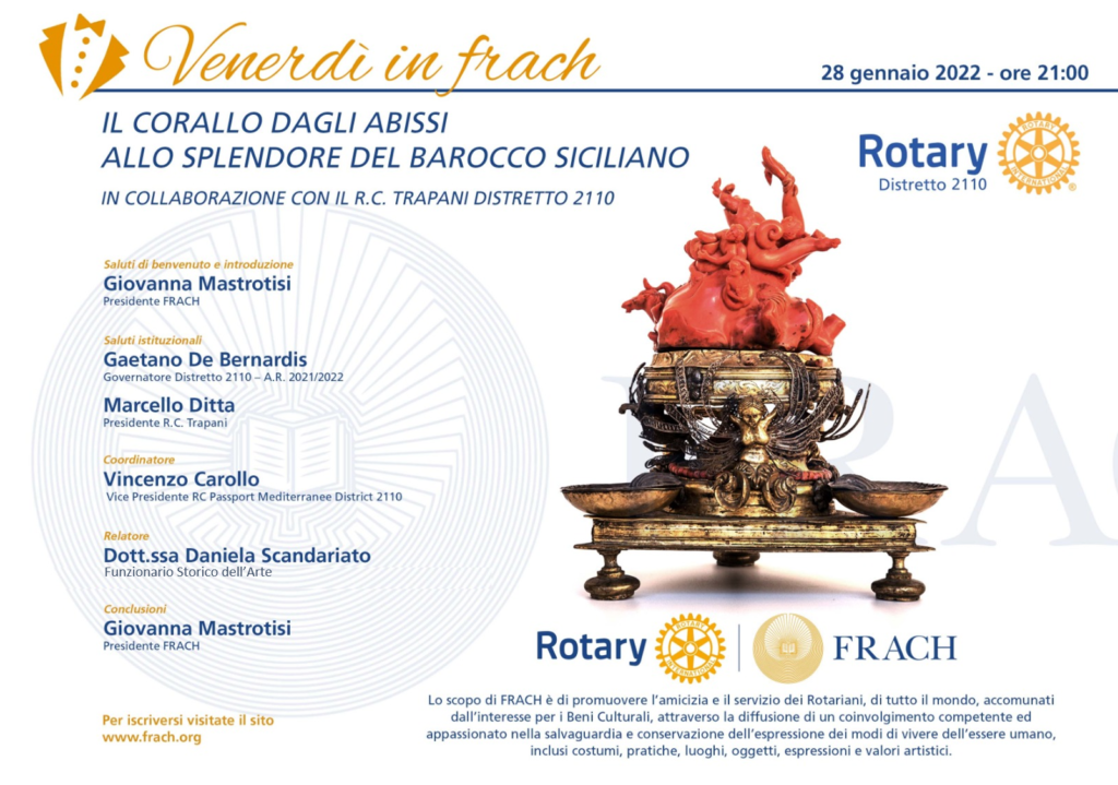 Lo scopo di FRACH è quello di promuovere l’amicizia e il servizio dei Rotariani, di tutto il mondo, accomunati dall’interesse per i Beni Culturali, attraverso la diffusione di un coinvolgimento competente ed appassionato nella salvaguardia e conservazione dell’espressione dei modi di vivere dell’essere umano, inclusi costumi, pratiche, luoghi, oggetti, espressioni e valori artistici.